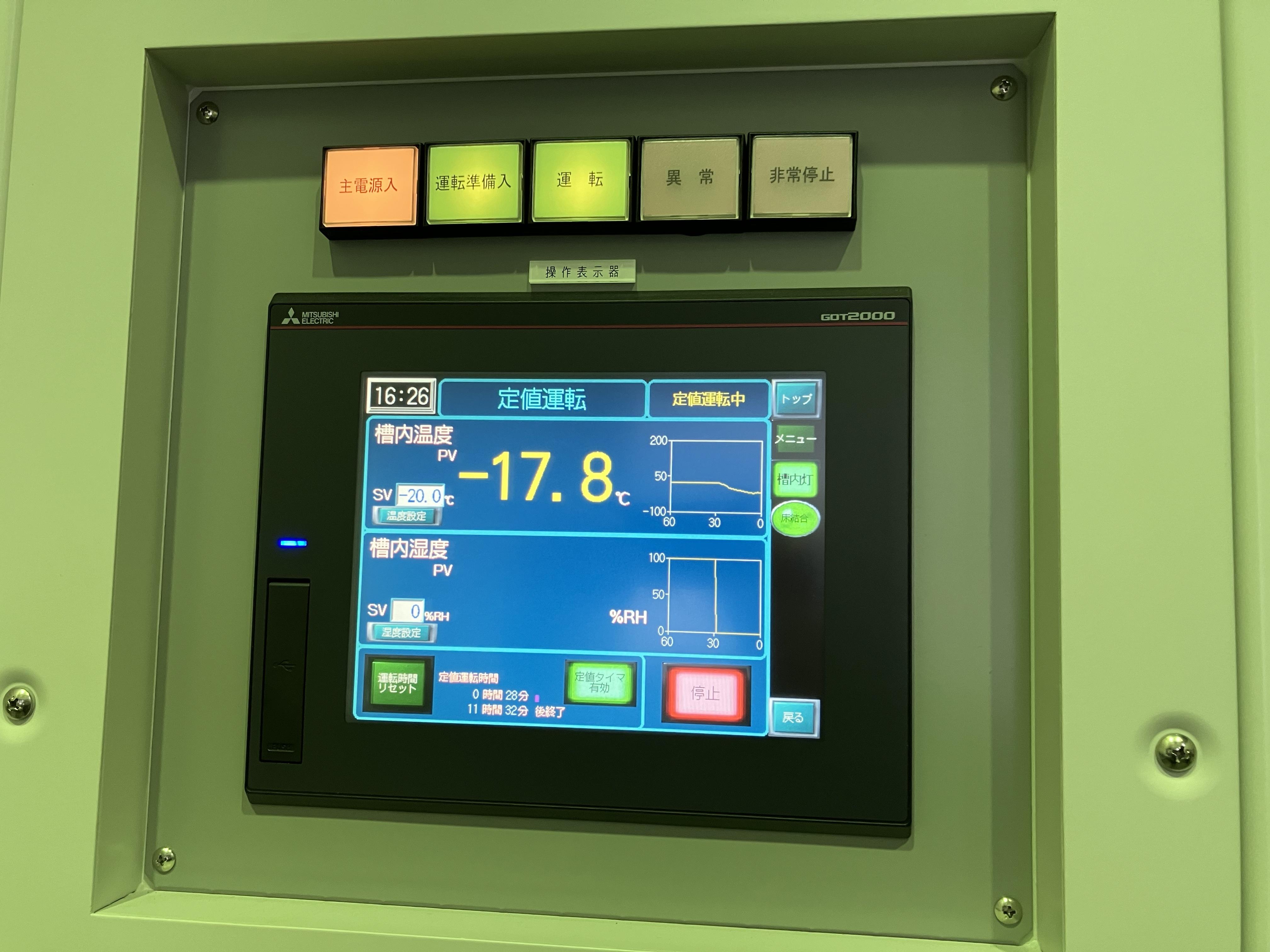 宮崎県の技術試験場で恒温槽を用いた高温・低温試験や振動試験を行いました。良好な成績を収めました。